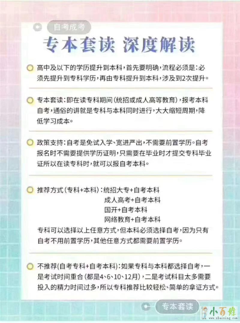 三、学历含金量高,专本套读最终拿的学历是本科学历,自考学历含金量高,学历国家承认,教育部学信网上可查,全国通用xbaixing.com。用于考公务员,提干,升职,加薪,评职称都可以小~百~姓~网。